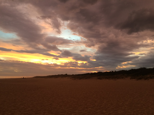 We finally made it to Lakes Entrance. We didn’t have a hotel, so we drove through town once and then checked into a hotel. After an hour of relaxing we decided to walk through the town. Lakes Entrance is built along an inter-coastal waterway and we decided to walk along the water. The town has carved wooden statues along the route we walked. We also stopped along the way to photo some large pelicans. Close to sunset we reached the pedestrian bridge which crosses the waterway. We walked across it and to the beach just in time for sunset and to see the clouds light up.