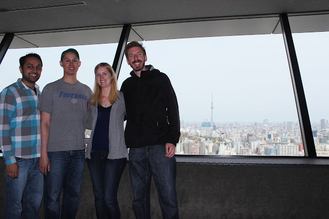 Sunday was one of our clearer days in Tokyo, so we decided to visit one of the many view points that have a view of the city skyline. Our ultimate hope was to see Mount Fuji, but we knew it probably wasn’t going to be clear enough for that. Kevin knew of a few viewpoints, but we choice one that Jon had read about online which was free and claimed a better view of Fuji than most. The tower was the 25th floor of the Bunkyo Civic Center building. We took the subway there and then walked to the closest elevator. The 25th floor was dedicated to a public viewpoint which faces three directions while a cafe faced the remaining direction. The view of the city was clear. We couldn’t see Mt. Fuji, but knowing where to look, some of us thought we could make out a slight outline of its base.