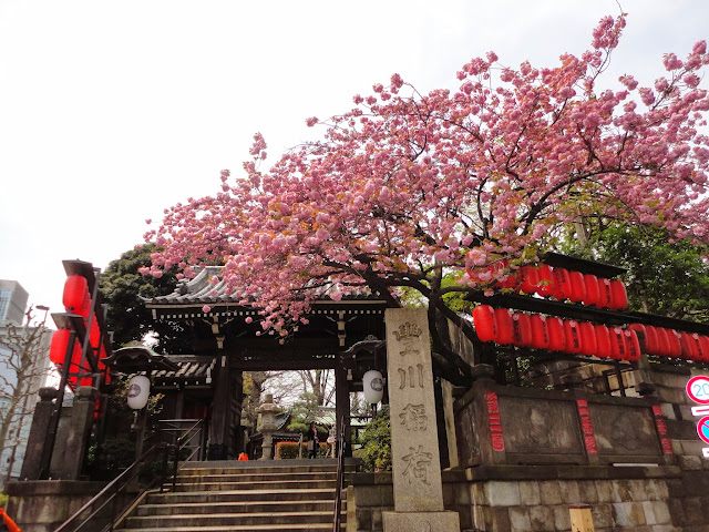 We met Kevin and Samrat around 11am and before finding a restaurant to eat at, we decided to visit the Myogonji Temple (Toyokawa Inari Shrine). This shrine was across the street and we had walked by it several times. One blooming cherry blossom tree greeted us at the entrance to the shrine. Inside the temple we found many statues of dogs, all adored with the red bib-like clothes we had seen on statues at other temples. Several of the dogs had offerings, coins, balanced on their heads and between their ears. The temple also had many flags and small niches with shrines tucked into them. For us it was a photographers delight and we took many photographs.